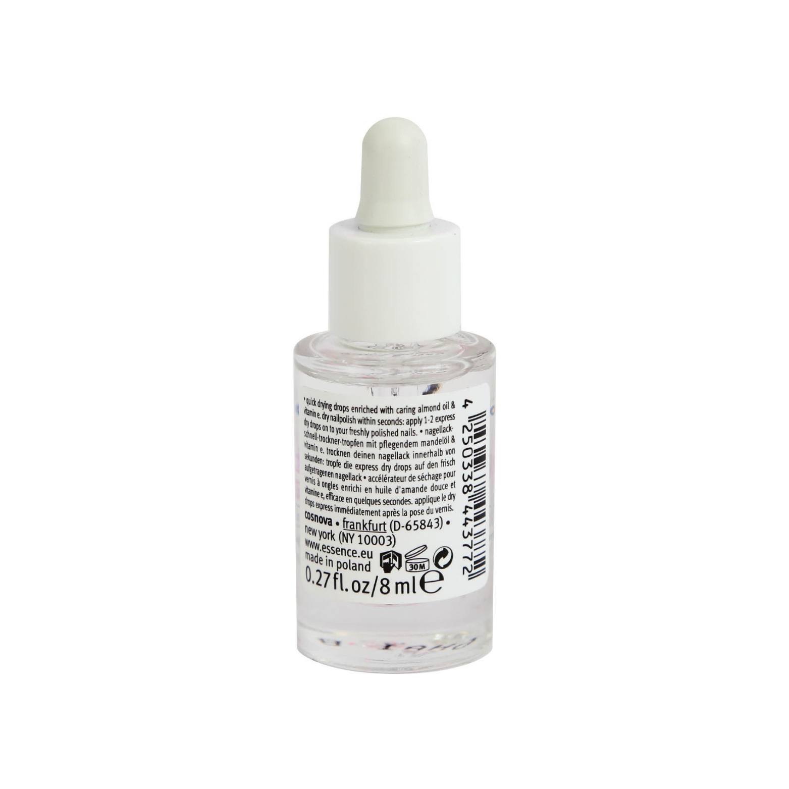 قطرات Essence Nail Art Express Dry Drops 8ml تساعد على تجفيف المانيكير بسرعة يجف الطلاء في 60 ثانية فقط، القطارة تجعل من السهل التحكم في حجم الدفعة تحتوي على فيتامين E وزيت اللوز لإضافة لمعان للأظافر